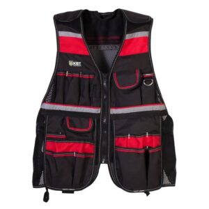 • Материал: дышащий сетчатый синтетический материал и влагозащитный полиэстер 1680D Оксфорд • Конструкция: • 2 нагрудных кармана с 5 отделениями в каждом • 2 передних кармана с 10 отделениями в каждом • 2 кармана на липучках на пояснице • 2 петли на липучках для подвешивания габаритного инструмента • Четыре широких боковых ремня для регулировки объема жилета • Широкие липучки на плечах для регулировки длины жилета • Прочная усиленная молния с крупными звеньями • Светоотражающие полосы на плечах, груди и спине • Легкий и универсальный жилет монтажника с регулировкой по объему и длине • Легкая вентилируемая сетчатая ткань на спине • Петля для подвешивания • Вес: 600 г