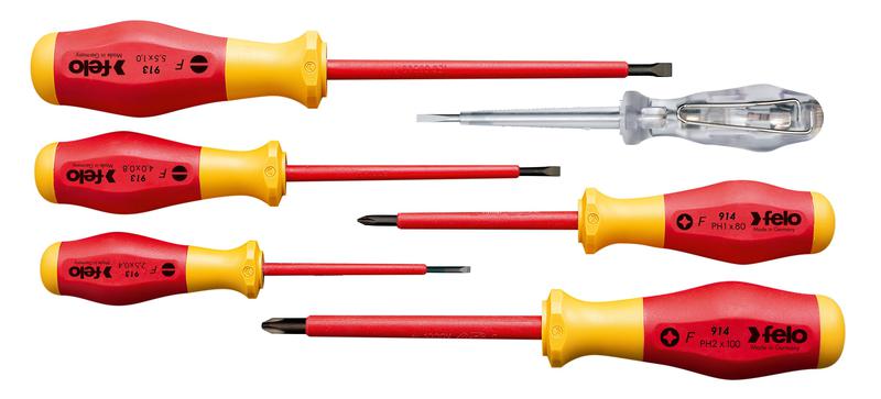 Набор диэлектрических отверток 900-ой серии предназначен для электромонтажных работ под напряжением до 1000 В с крепежом сечения SL и PH. Эргономичный дизайн рукоятки и противоскользящий материал (Soft Grip) помогает обеспечить наибольшую передачу усилия. Специальный дизайн двухкомпонентной рукоятки не позволяет инструменту скатываться с поверхности. Лезвия изготовлены из специальной хромомолибден-ванадиевой стали для достижения наилучшего результата при работе! Точная посадка в крепеж обеспечивается за счет черного наконечника (Black-Tip). Состав набора: VDE SL: 2,5 x 75 / 4,0 x 100 / 5,5 x 125 VDE PH: PH 1 x 80 / PH 2 x 100 отвертка тестер напряжения сети