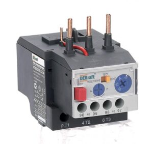 Тепловое реле перегрузки серии РТ-03 DEKraft; предназначено для применения с контакторами КМ-103 на ток 25-32 А; трехполюсное; диапазон уставок реле 23-32 А; класс расцепления 10А; два режима повторного включения — ручной и автоматический. Тепловые реле РТ-03 применяются для защиты цепей переменного тока и электродвигателей от перегрузки, асимметрии фаз, затянутого пуска и заклинивания ротора. Реле подходит к соответствующим контакторам других производителей.