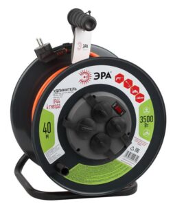 Удлинитель силовой на металлической катушке ЭРА RMx-4es-3×1.5-40m-IP44 с заземлением, с выключателем, ПВС 3×1,5м2, 4 розетки, 40м, степень защиты IP44. Мощность 16А/3500Вт. Используется для работы на строительных площадках или дачных участках. Удобен при работе с приборами находящимися удаленно от стационарной розетки. Например, газонокосилки, электрические, пилы, триммеры или электродрели. Провод в удлинителях Эра сделан из 100% меди, что делает его абсолютно пожаробезопасным. Рама удлинителя сделана из высокопрочной стали.